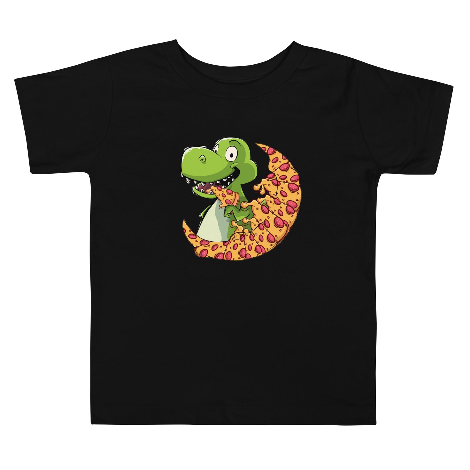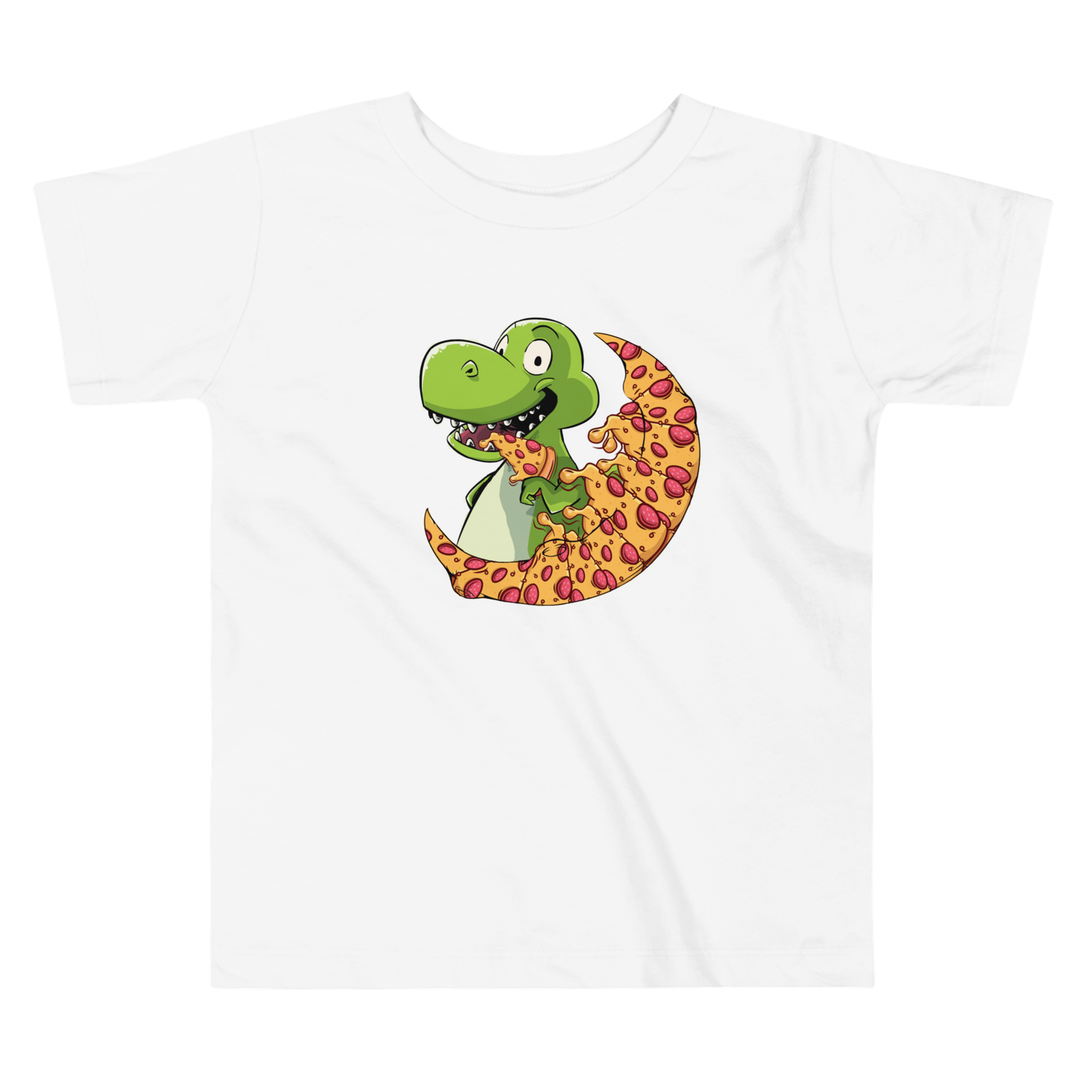Our pizza-themed t-shirt features a dinosaur eating a slice of a pizza half-moon and is perfect for girls who love dinosaurs and eating pizza. If your little girl loves dinosaurs, get this t-shirt for her!